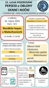 (Letošní 14. ročník prázdninového pozorování meteorického roje Perseid, který se tradičně koná v oblasti tmavé oblohy na Novákově kopci v obci Malechovice v Českém ráji, v první části nabídne zajímavé prezentace MB hvězdárny prokládané hudebními vystoupeními pod stanem, soutěžemi pro děti i dospělé. Krátké přednášky nejen o Perseidech, astronomické technice a výzkumu vesmíru, podle možností pokusy, pozorování dalekohledy za světla i za tmy, taneční bloky salsy s živými perkusemi aj. Zábavně-vzdělávací akce je vhodná pro rodiny s dětmi a ostatní zájemce o uvedená témata. Podrobnější program i organizace akce bude upřesněna zde v cca dvoudenním předstihu s ohledem na aktuální předpověď počasí. Viz mapa https://mapy.cz/zakladni?x=15.1876939&y=50.4949310&z=18 – případně si upravte zoom pomocí [+]/[-].)
